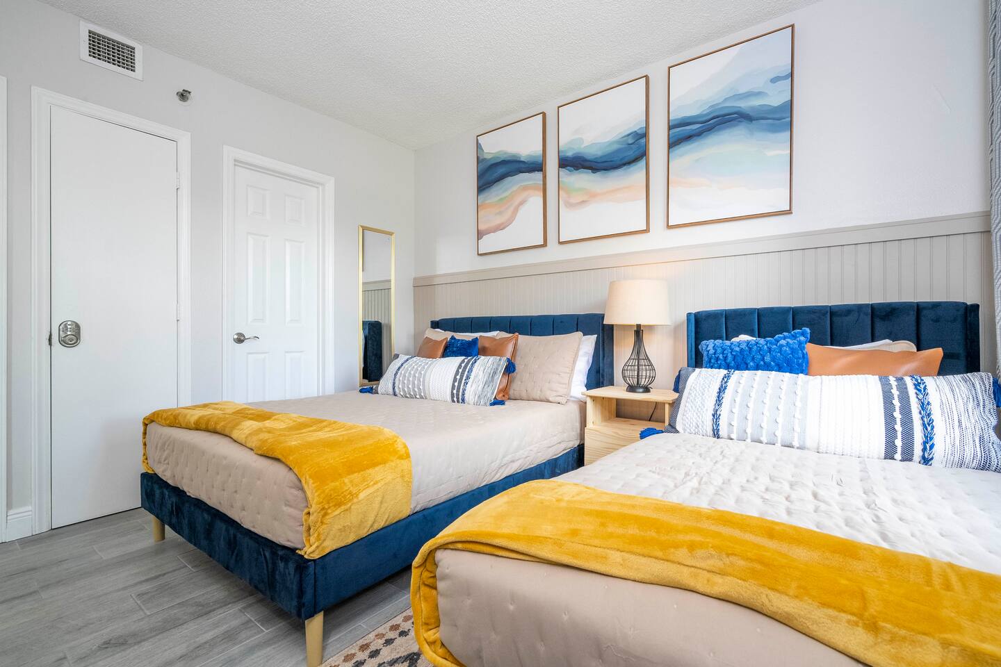 WELCOME to this newly renovated apartment centrally located minutes from Universal Studios and a short distance from I-drive. Very close to Premium Outlets, SeaWorld, Convention Center and everything you may need such as shopping and restaurants. Modern and cozy, it has a balcony with a peaceful view and is fully equipped with appliances and furniture. These 2 suites accommodate up to 6 people. You can also enjoy the amenities within this building such as swimming pools, gym, playground for children and much more.